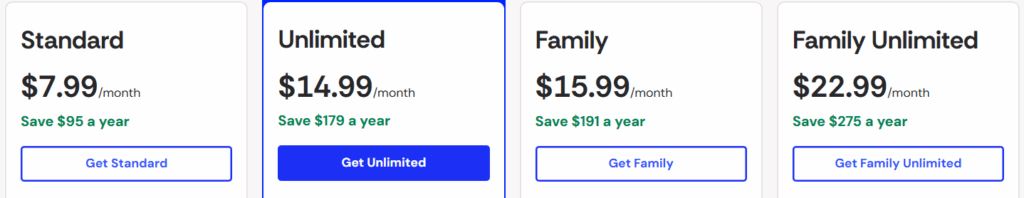 | Individual Plan Price (Annual) | $8.33/mo ($99.96/yr) | $10.75/mo ($129/yr) | $6.49/mo ($77.88/yr) | $9.99/mo ($119.88/yr) | $13.29/mo ($159.48/yr) | $15.00/mo (No annual discount) |
